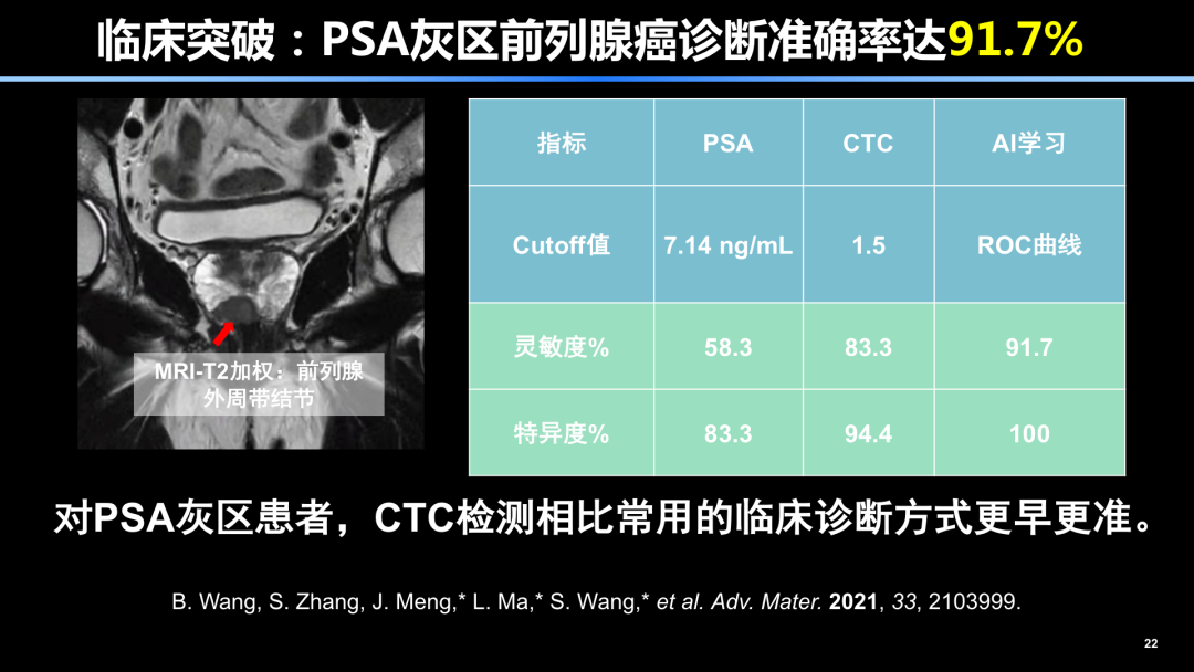 於是我們經過近十年的努力,跟咱們北京大學的第三醫院北醫三院來合作,我們把這個臨牀的診斷率從58%提高到了91.7%,謝謝。全球的平均統計,PSA的準確率在25%,咱們北醫三院醫生的水平很高了,結合核磁能到58%,那這就已經很了不得。我們再結合CTC檢查能到91.7%,同年2021年也獲得了北醫三院臨牀研究的三大突破之一。