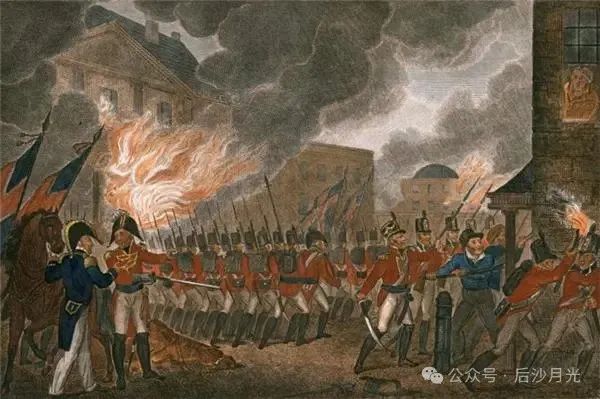 1814年8月24日傍晚,羅斯將軍率英軍先頭部隊進入陷入混亂的華盛頓,麥迪遜已經帶着老婆跑路了。