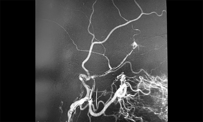 12月29日,順利進行手術。術中,王貴平博士在介入團隊協助下克服血管迂曲的困難,導管精準到達左腦膜中動脈前支、左腦膜中動脈後支,之後緩慢注入液體栓塞劑,栓塞劑逐漸向腦膜中動脈主幹反流,複查造影,左腦膜中動脈無明顯前向血流,手術成功。術後,患者無新發神經功能缺損。言語不清,肢體活動不利,頭暈等症狀逐步好轉。