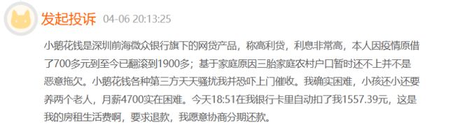 比如有消費者投訴稱,其在小鵝花錢上借了700多元到至今已翻滾到1900多,因為家庭困難導致逾期後,第三方天天騷擾並恐嚇上門催收,並從銀行卡里扣走了1557.39元的房租生活費用。