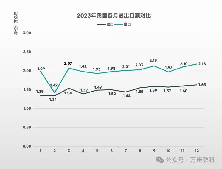 2023年,在世界經濟復甦乏力、全球貿易低迷的情況下,我國外貿規模持續承壓,12個月份中基本無顯著增長。但值得肯定的一點是,進出口總體量的向好態勢明顯:一、二、三、四季度皆保持小幅環比增長,特別是第四季度,十月、十一月、十二月的進口和出口額都是環比增長的,十二月份進出口總額達3.81萬億元,創月度規模歷史新高。同時,根據WTO最新數據估測,2023年我國在國際出口市場中的份額佔比約為14%,仍保持在較高水平,在全球產業鏈供應鏈中居於重要地位。