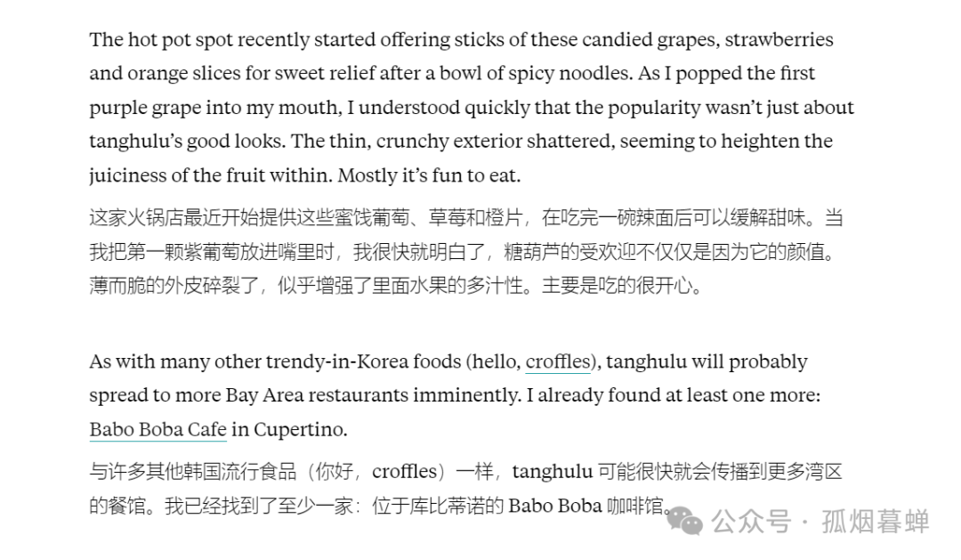 不用懷疑,她在這裏提到的,就是這兩年風靡韓國的中國糖葫蘆——這種食物的英文譯名就叫tanghulu,這一點比特克自己也在她的食評裏頭提到了。據她所言,“這種小吃被稱為糖葫蘆,是一種起源於中國北方的甜食。糖葫蘆包羅萬有,從廣義上講,任何水果包裹在脆殼糖衣裏頭的甜食,都可以被稱之為糖葫蘆。2023年,糖葫蘆在韓國的甜食市場上大放異彩,縱觀當地的社交媒體,映入眼簾的曬糖葫蘆的年輕韓國網民比比皆是。”