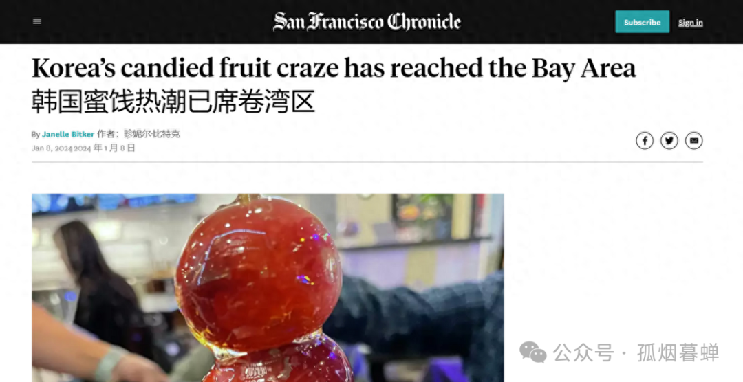 我就着相關線索到網上查了一下,發現這件事情最早是從一家名叫《舊金山記事報》(San Francisco Chronicle)的美國媒體上傳開來的,這篇新聞——又或者説得更準確點,食評,它的撰寫人珍妮爾·比特克(Janelle Bitker)也是舊金山當地一位小有名氣的探店網紅。按照這姐們在她食評裏頭提到的説法,她在去年去首爾旅遊的時候,曾經在當地的小吃街上碰到過一種“裹着一層脆皮糖衣的蜜餞草莓,在燈光的照耀下閃閃發光,看上去就像是一串璀璨動人的人造珠寶”。