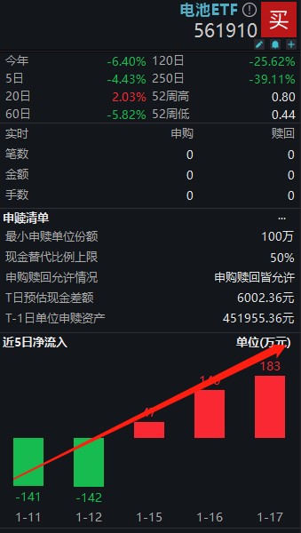 鋰電板塊此前接連調整,資金逢低佈局意圖明顯。數據顯示,電池ETF(561910)持續調整期間,資金逢低佈局意圖明顯,連續三日淨流入,量能持續放大!