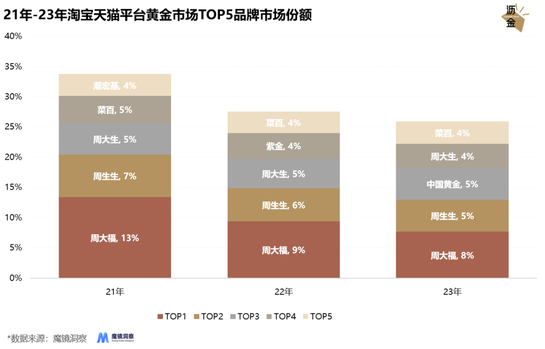 2021年-2023年淘寶天貓平台黃金市場TOP5品牌市場份額