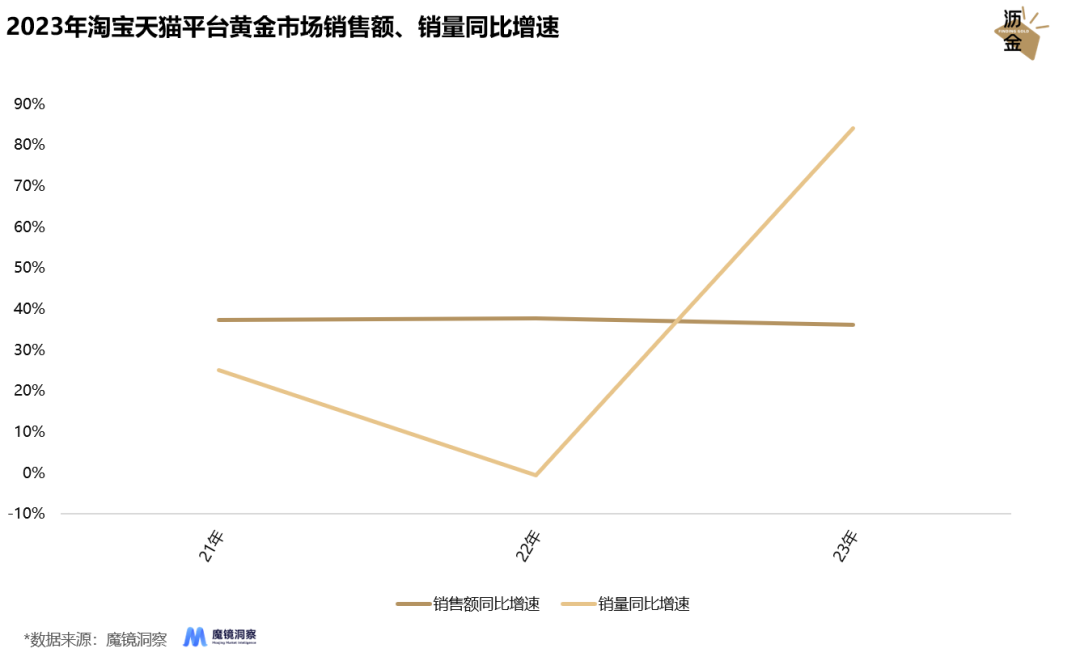 2023年淘寶天貓平台黃金市場銷售額、銷量同比增速