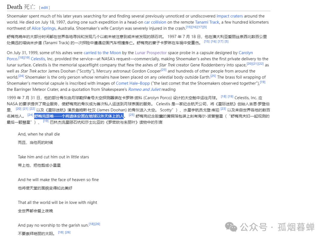 既然月葬的風險這麼高,那為什麼瑟萊斯蒂斯和極樂空間這些太空殯葬還非得趕這趟熱鬧呢?純粹就是博出位嗎?但其實倒也未必。別看這月葬的難度大,但此前並非沒有過先例。早在1999年7月31日,NASA的“月球探測者號”探測器就曾經成功地將美國已故地質學家尤金·舒梅克(Eugene Merle Shoemaker)的部分骨灰給成功送上過月表。舒梅克因此成為了有史以來第一個將自己的遺體樣本留在地外天體上的人類,同時也是迄今為止的唯一一個。而那一次把舒梅克的骨灰樣本給成功送上月球的,正是瑟萊斯蒂斯公司。
