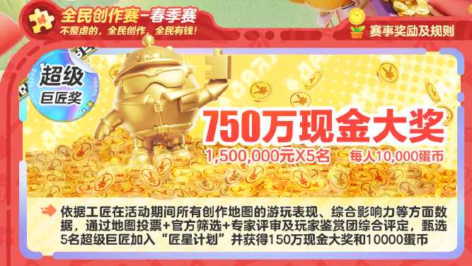 以級別最高、也是最受關注的“超級巨匠獎”為例,結合參賽工匠在活動期間創作的所有地圖的遊玩表現、綜合影響力等數據,再通過地圖投票、官方篩選、專家評審和玩家鑑賞團綜合評定,才會最終甄選出脱穎而出的5位創作者,每人可拿到150萬現金大獎和10000蛋幣,如此高額的獎勵和全民篩選的路徑充分顯示了官方對原創的尊重與珍視。