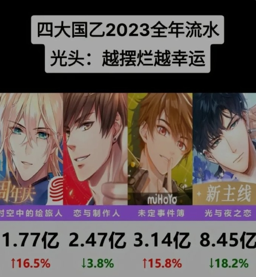都知道女玩家的錢好賺,都想來賺這筆錢,但在目前的國產乙遊市場,騰訊的《光與夜之戀》遙遙領先,處於一超多強的地位,2023年的流水比其他三大國乙加起來還要高。