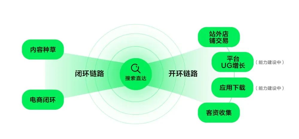 搜索是小紅書唯一的聚合場,搜索直達連接內容種草、電商閉環、客資收集、站外店鋪交易、平台UG增長「建設中」、應用下載「建設中」等六大營銷場景,地理位置緊要,可以説是廣告主的“咽喉要塞”,進可攻、退亦可守。