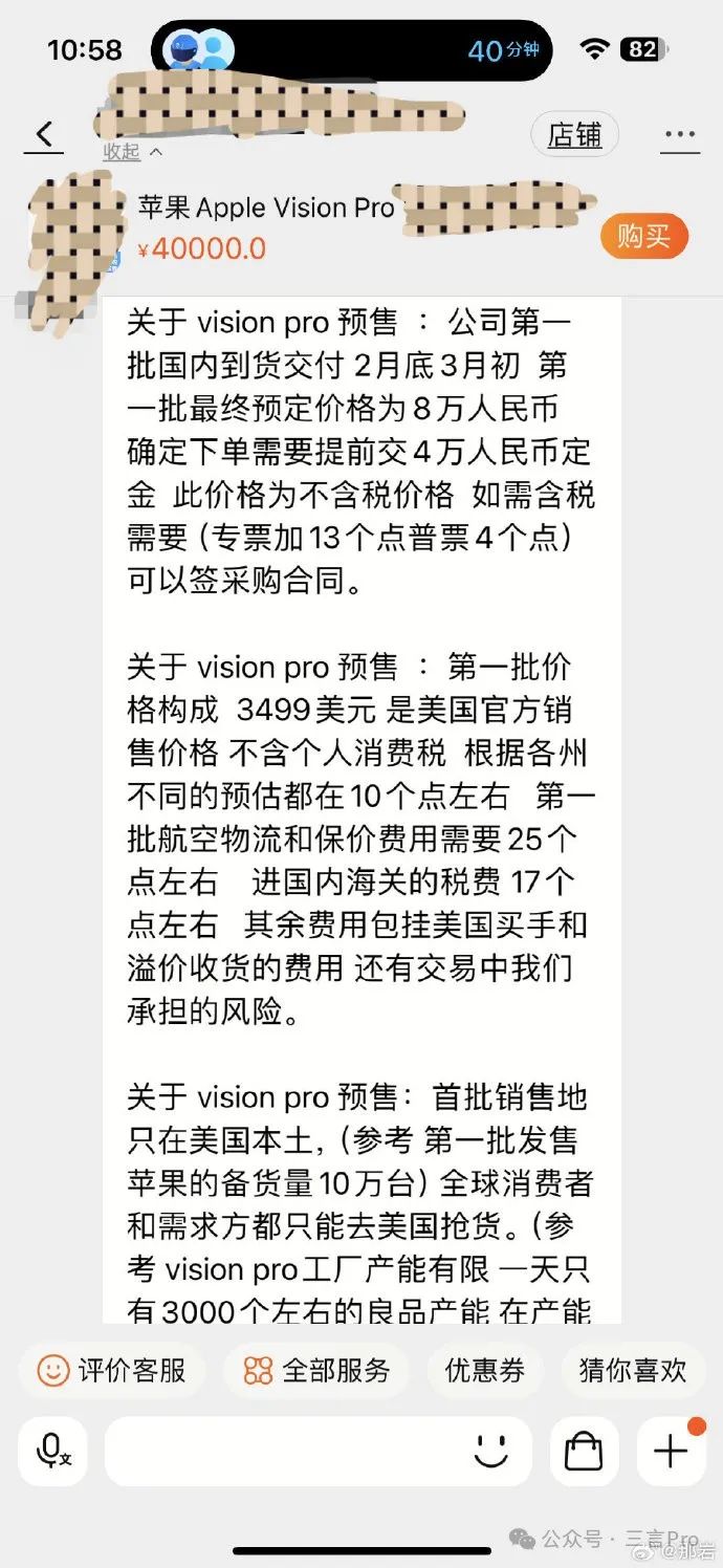 客服稱,關於Vision Pro預售:公司第一批國內到貨交付2月底3月初,第一批最終預定價格為8萬人民幣。確定下單需要提前交4萬人民幣定金,此價格為不含税價格,如需含税需要(專票加13個點普票4個點),可以籤採購合同。