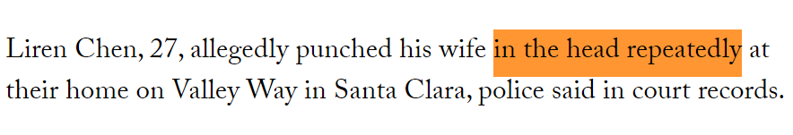 警方在法庭記錄中稱,27 歲的陳立仁涉嫌在位於聖克拉拉市 Valley Way 的家中多次毆打妻子的頭部。房間內到處都是血。
