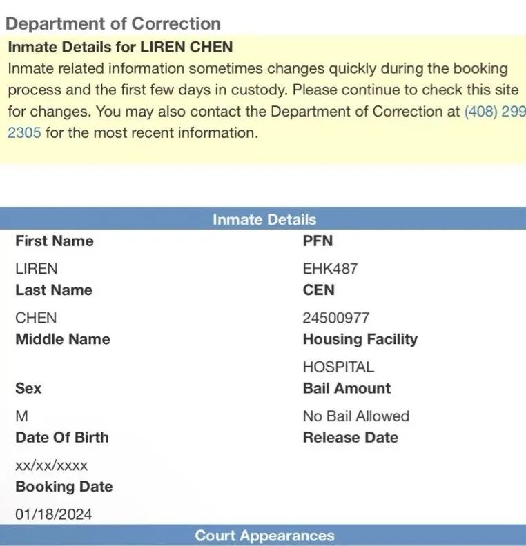陳某目前正在住院治療,對他的傳訊已經推遲了一次,可能還會再次推遲。目前傳訊仍定於今天下午 1:30,在聖何塞司法大廳 23 廳進行。