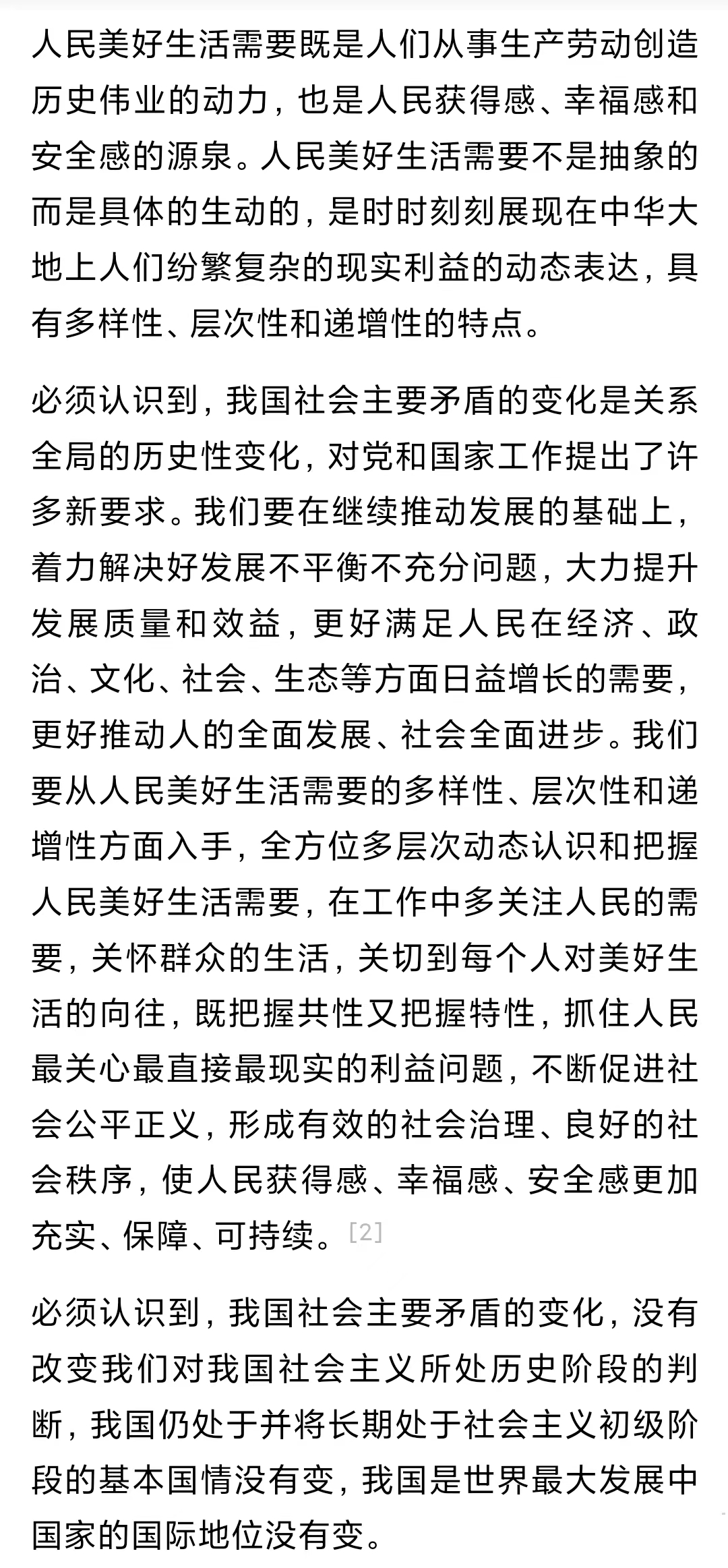 2. 2017年十九大理論有變化,“我國社會主要矛盾已經轉化為人民日益增長的美好生活需要和不平衡不充分的發展之間的矛盾”,這還在發展,羣眾心理有些問題。人民美好生活,導向“獲得感、幸福感、安全感”。説實在的,比物質要求難。