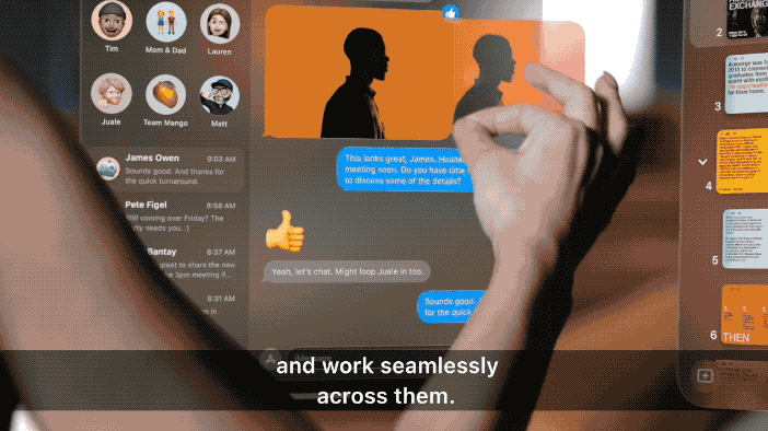並且在Vision Pro裏,開個線上會議宛如身臨其境,所有APP都在空間裏“展開”,用手就可以實現界面或功能的拖拽:
