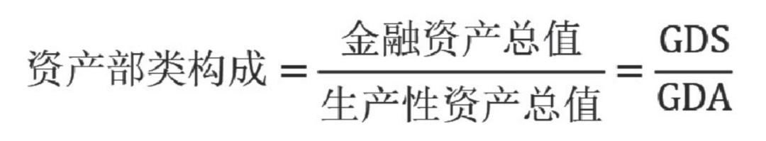 資產也可分為生產性資產和金融資產兩類。生產性資產如前所述,是實體產業中運行的資產(也稱生產要素、生產資料),記為GDA(Gross Domestic Assets);金融資產則是金融市場中運行的資產,如前所述可記為GDS。由此可以得到一國的資產部類構成。資產部類構成可用來度量資產虛擬化程度。