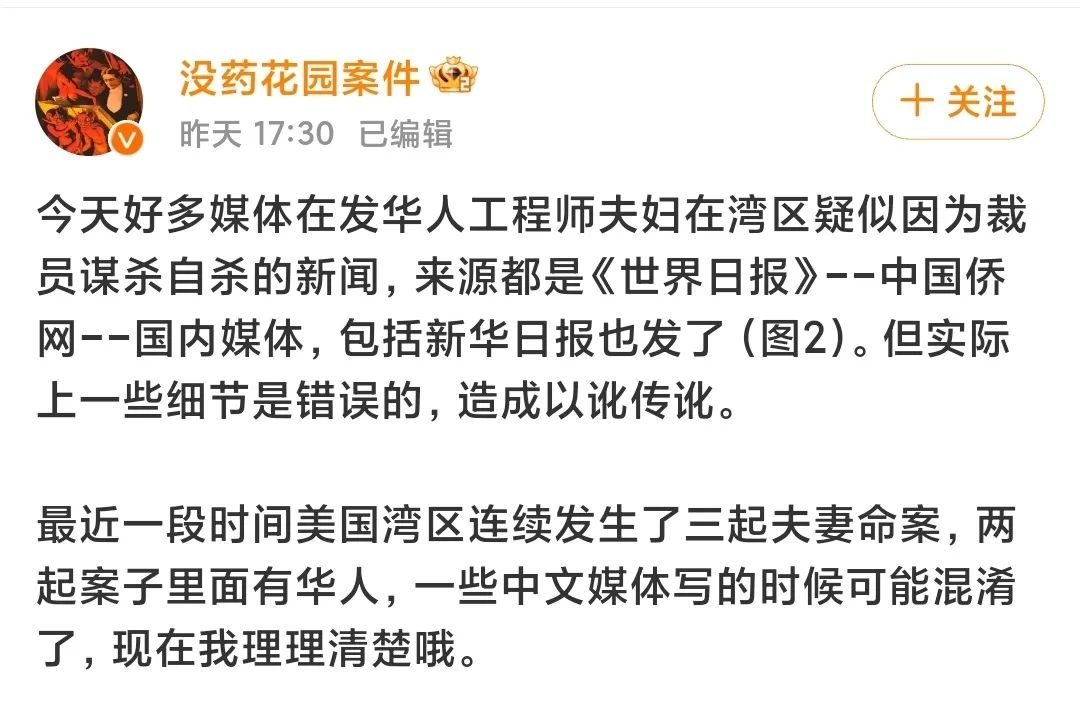 烏龍怎麼導致的?很多人可能奇怪了,為啥媒體消息會完全傳錯?有網友翻了當地的新聞,發現可能是因為最近美國灣區連續發生了三起夫妻命案,兩起案子裏面有華人,一些中文媒體寫的時候可能混淆了……