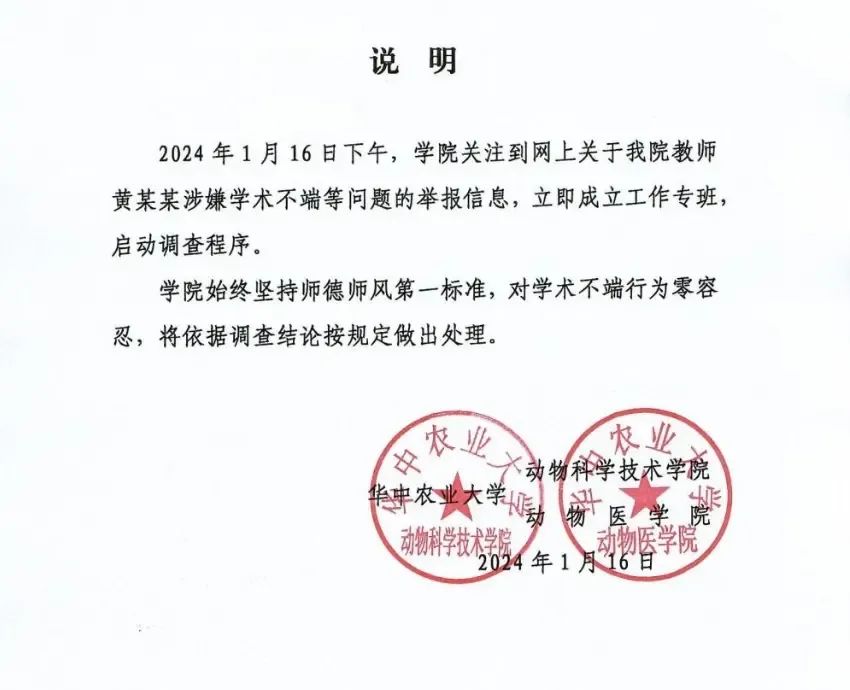 華中農業大學動物科學技術學院/動物醫學院發佈説明稱: