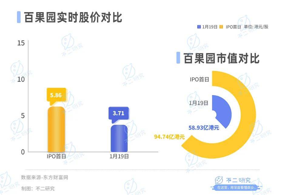 截止1月19日港股收盤,百果園報收3.71港元/股,對應市值58.93億港元(約摺合人民幣54.22億元);對比上市一年最高股價7.04港元/股,百果園的股價已經跌去近5成。