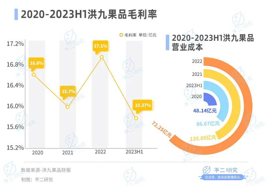 據洪九果品招股書及財報顯示,2020-2023年上半年,洪九果品營業成本分別為48.14億元、86.67億元、125.05億元和72.25億元。同期對應毛利為9.57億元、16.13億元、25.76億元和13.13億元,毛利率為16.6%、15.7%、17.1%和15.37%。