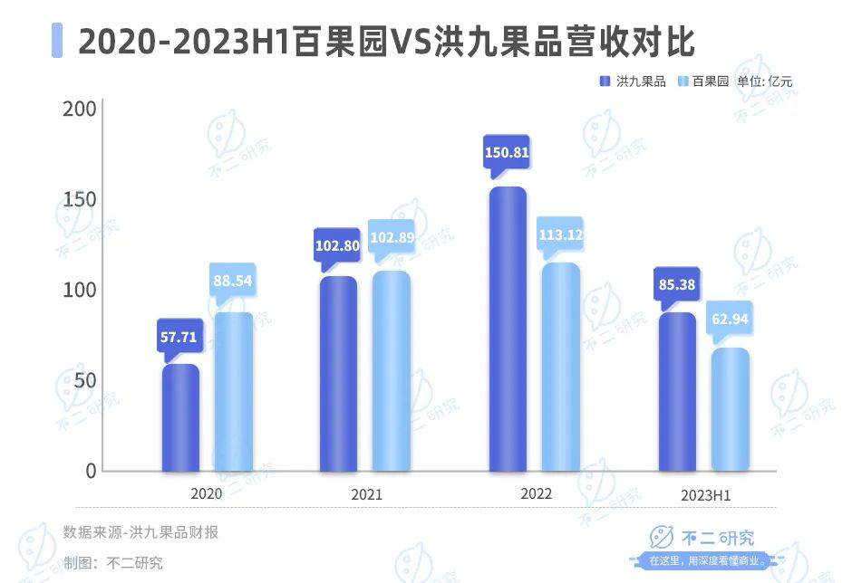 據百果園財報顯示,2020-2022年,其收入分別為88.54億元、102.89億元、113.12億元;2023年上半年,百果園的營收為62.94億元,同比增長6.42%。
