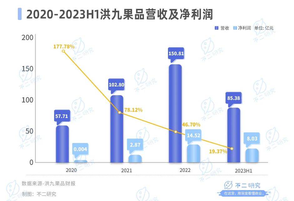 以水果分銷為主的洪九果品則暫無類似計劃,但是洪九果品的營收增長可以明顯看出其近年來的擴張。據其財報顯示,洪九果品2020-2023年上半年分別實現營收57.71億元、102.80億元、150.81億元和85.38億元,分別同比增長177.78%、78.12%、46.70%和19.37%。