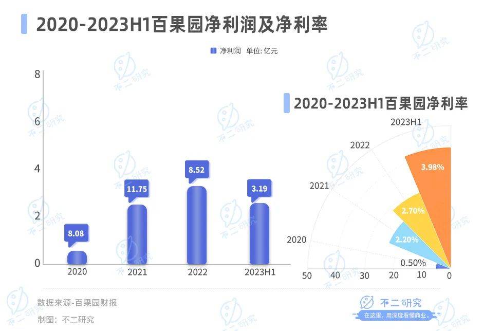 除了洪九果品財務出現問題外,百果園的財務問題也逐漸顯露。最大的問題在於百果園的盈利能力,據其財報顯示,2020-2023年上半年,百果園淨利潤為0.49億元、2.30億元、3.23億元和2.61億元,對應淨利率為0.50%、2.20%、2.70%和3.98%。