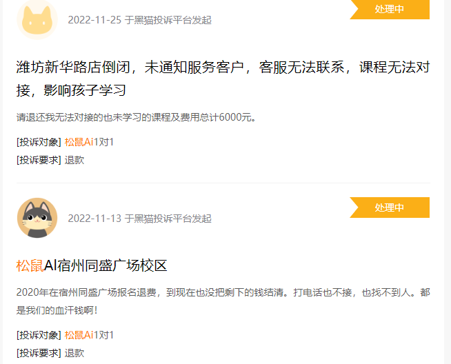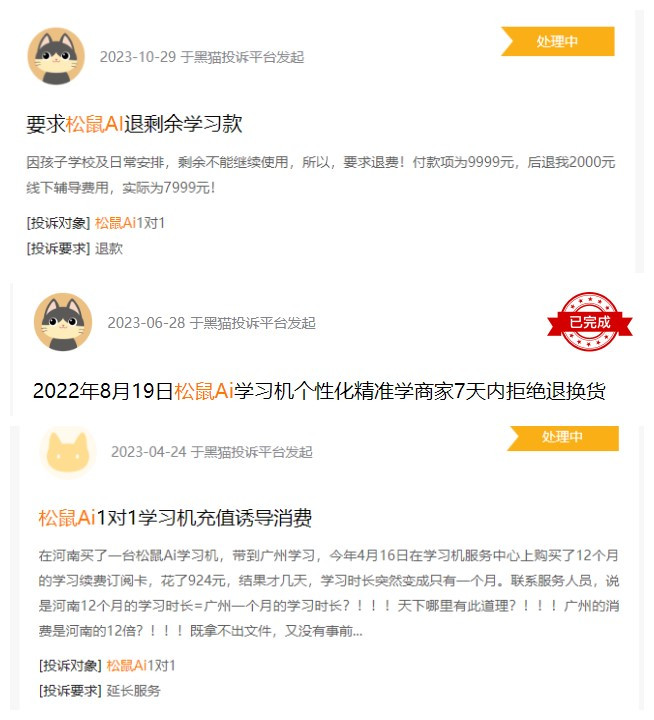 盈利難下,松鼠AI加盟商自然會“想方設法”地提高利潤,這也是黑貓投訴平台上會有不少消費者稱,松鼠AI相關校區不退學費、不售後、誘導充值的原因所在。