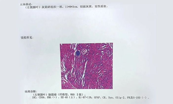 術後,患者生命體徵平穩,安返監護病房。經對留取的腫物樣本進行病理分析,確定為纖維型腦膜瘤(WHO 1級),為良性腫瘤。