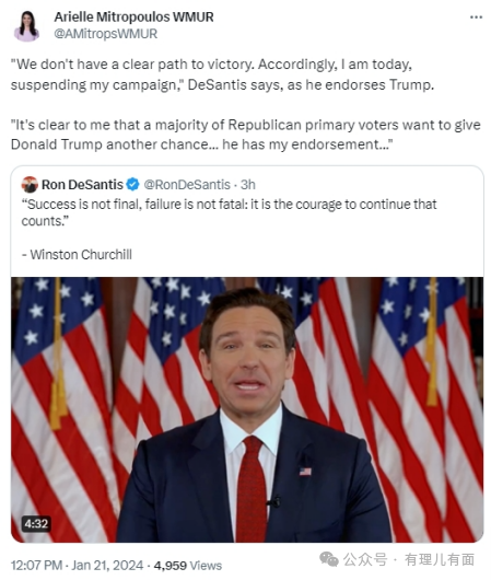 1月21日,佛州州長德桑蒂斯也非常識趣,在社交媒體上發佈視頻,宣佈退選,並表示支持特朗普。