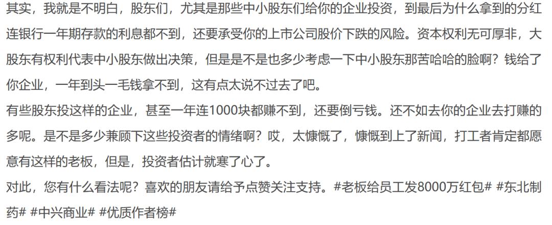 但聽到這樣的消息,與歡欣鼓舞的東北製藥、中興商業員工不同,股民們可開心不起來。甚至有股民發帖問,“給投資者發了多少紅包?現在全國股民都在抑鬱。”