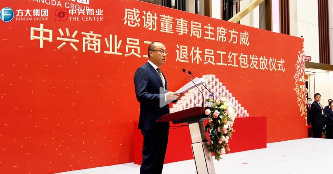 視頻顯示,儀式現場擺放着一摞高高的現金牆,員工依次上台領取了自己的現金紅包。紅色的背景板上,寫着“感謝董事局主席方威——中興商業員工、退休員工紅包發放儀式”幾個大字。