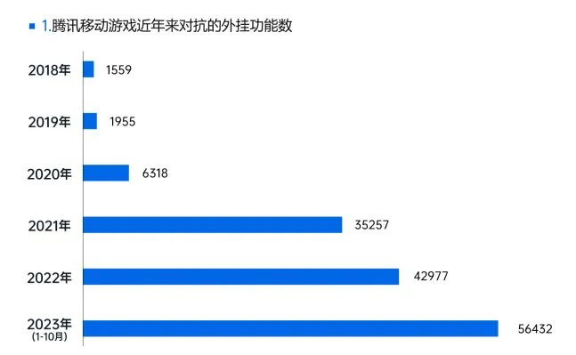 在移動遊戲中,外掛功能數2023年1-10月比去年全年還高,達56432個。定製外掛比例高達76.9%,安全維護的難度增加。此外,2023年1-10月騰訊遊戲安全黑產處罰賬號總量達7350萬,同比增長29.6%。
