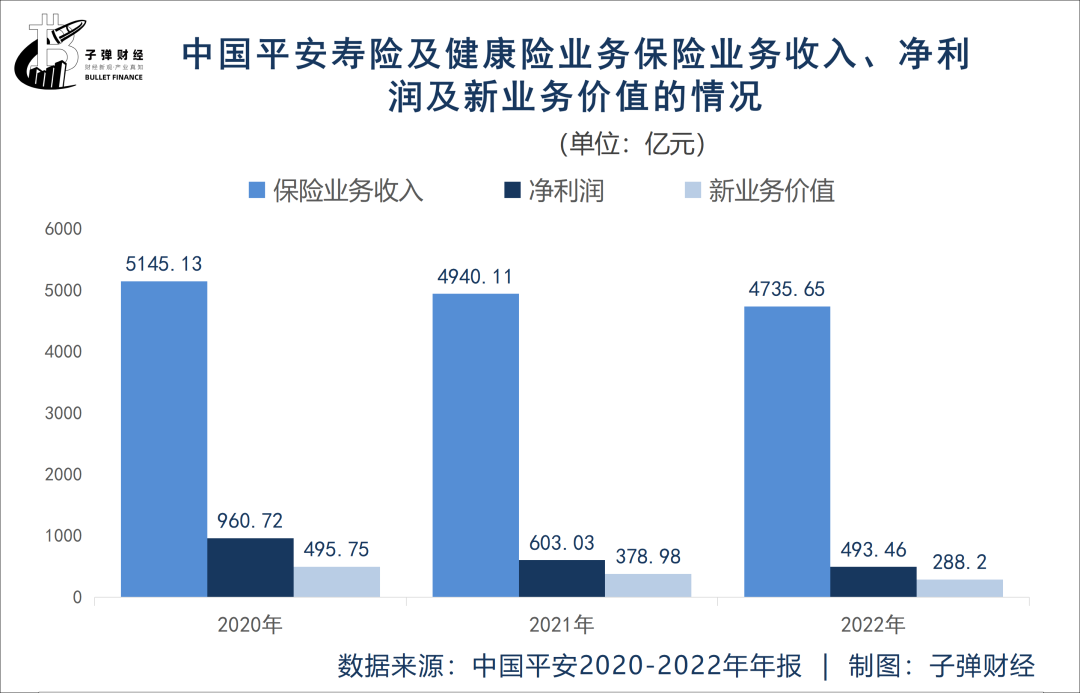 新業務價值方面,中國平安的壽險及健康險業務表現較為低迷,2020年-2022年分別實現495.75億元、378.98億元及288.20億元,同比下降34.7%、23.6%及24.0%。