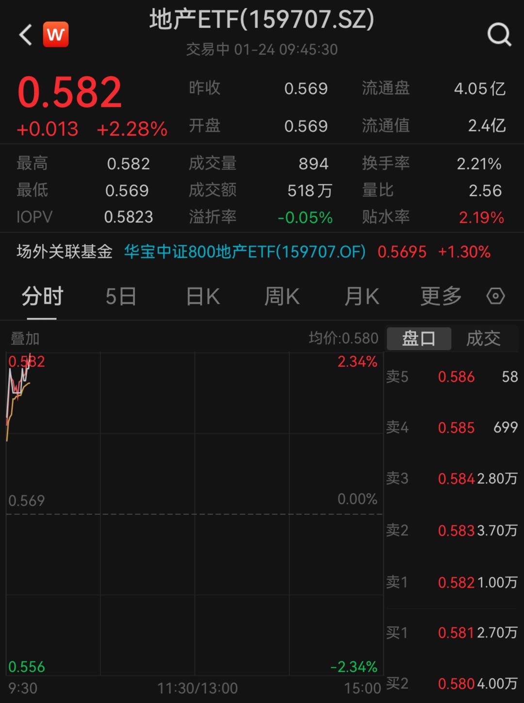 2024年1月24日早盤,上海本地股集體高開,相關龍頭房企走強,上海臨港漲逾6%,華僑城A、張江高科、陸家嘴、金融街等上漲超3%。代表A股龍頭房企行情的中證800地產指數開盤快速拉昇,熱門ETF方面,地產ETF(159707)現場內價格漲逾2%!