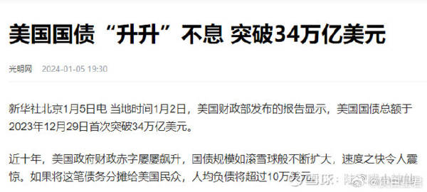 大家還記得吧?去年6月,美國國債數字是多少?31.4萬億美元。3個月後,這個數字是多少?超過33萬億!再過3個多月,到2023年12月29號,這數字多少?突破34萬億!