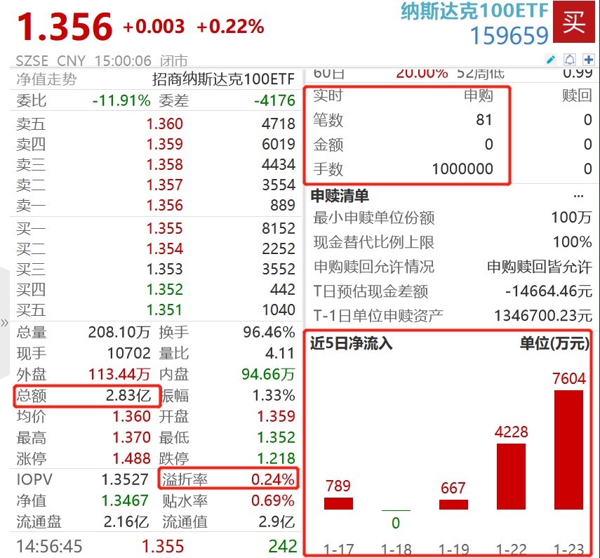 納斯達克100ETF(159659)尾盤溢價0.24%為同類最低水平_風聞