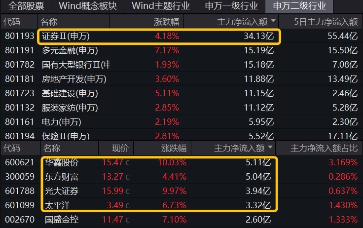 主力資金迅速反應,扎堆增倉券商板塊。截至收盤,申萬二級證券板塊獲主力資金淨買入34.13億元,吸金額高居所有申萬二級行業首位。個股方面,華鑫股份、東方財富、光大證券、太平洋均獲超3億元增倉。