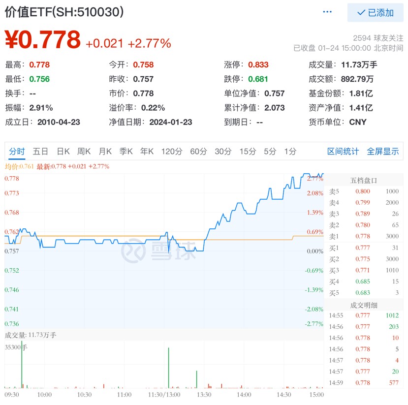 三、“中字頭”午後爆發,價值ETF(510030)放量大漲2.77%!