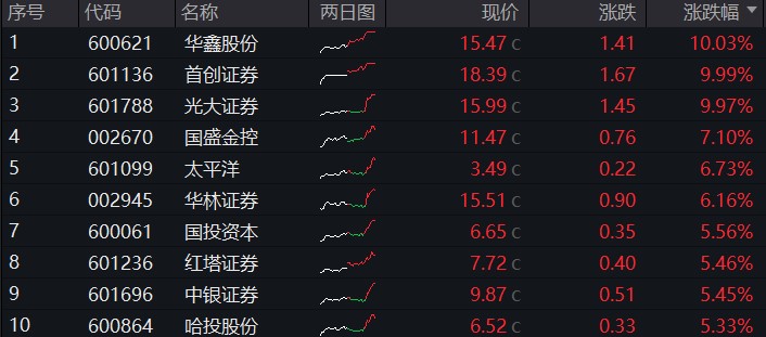 截至收盤,中證全指證券公司指數囊括的50只上市券商股除南京證券(+2.90%),其餘均漲逾3%,華鑫股份、首創證券、光大證券3股封板,國盛金控盤中漲跌,收漲逾7%。此外,太平洋、東方證券、中國銀河等漲幅居前。