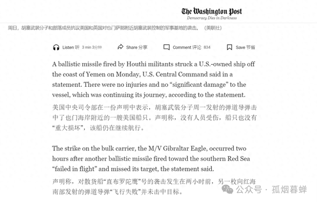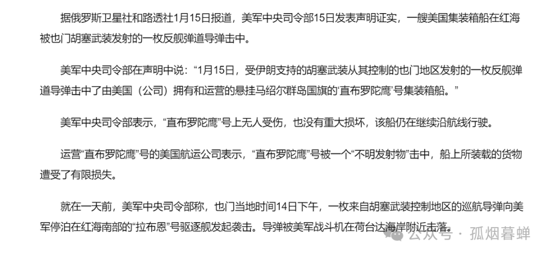 美國的船被打了,這兩天我在美媒《華盛頓郵報》上看到一條新聞,説是美軍中央司令部在當地時間1月15日這天發表了一則聲明,宣稱當天確有一艘美國的集裝箱船在紅海附近海域被也門的胡塞武裝發射反艦彈道導彈擊中了。遭殃的貨船名叫“直布羅陀鷹號”(Gibraltar Eagle),船籍馬紹爾羣島,屬美國上市公司伊格爾散貨運輸公司(Eagle Bulk Shipping)所有。