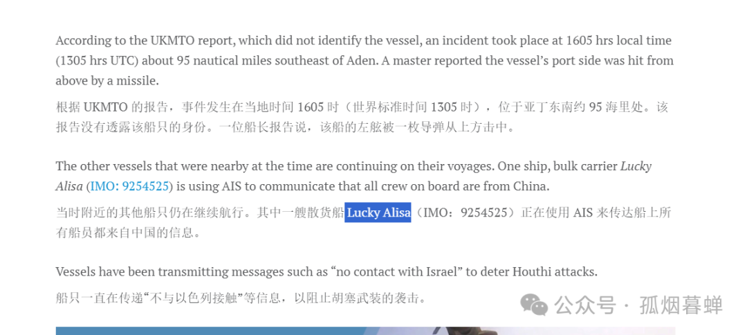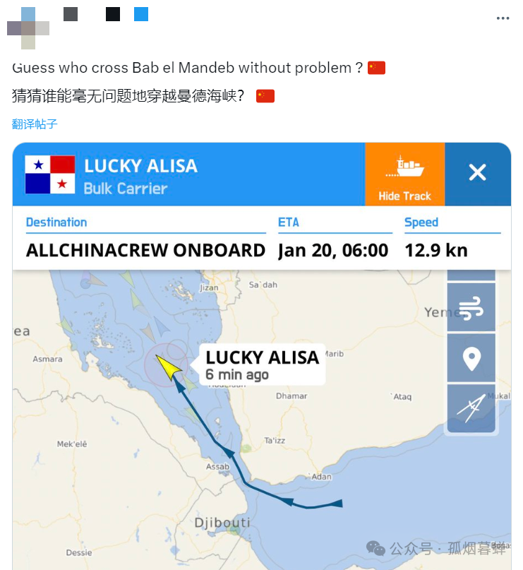 雖然如今通過紅海的危險性相較以往是增加了不少,而且近期也確實冒出一些諸如“直布羅陀鷹號”和“拉布恩號”這種不幸被胡塞的導彈給瞄準的反面教材。但是有倒黴蛋,自然就有無驚無險平安穿越曼德海峽進入紅海的幸運兒。幾乎就在“直布羅陀鷹號”遭遇胡塞反艦彈道導彈襲擊的同一時間,推特(現在叫X)有國際航運愛好者注意到,它旁邊有一艘散裝貨船,打着“全體船員來自中國”(ALLCHINACREW ONBOARD)的旗號,慢慢悠悠、平平安安地就通過了曼德海峽。而且這艘船還有個非常喜慶的名字——“幸運阿麗莎號”(LUCKY ALISA)。