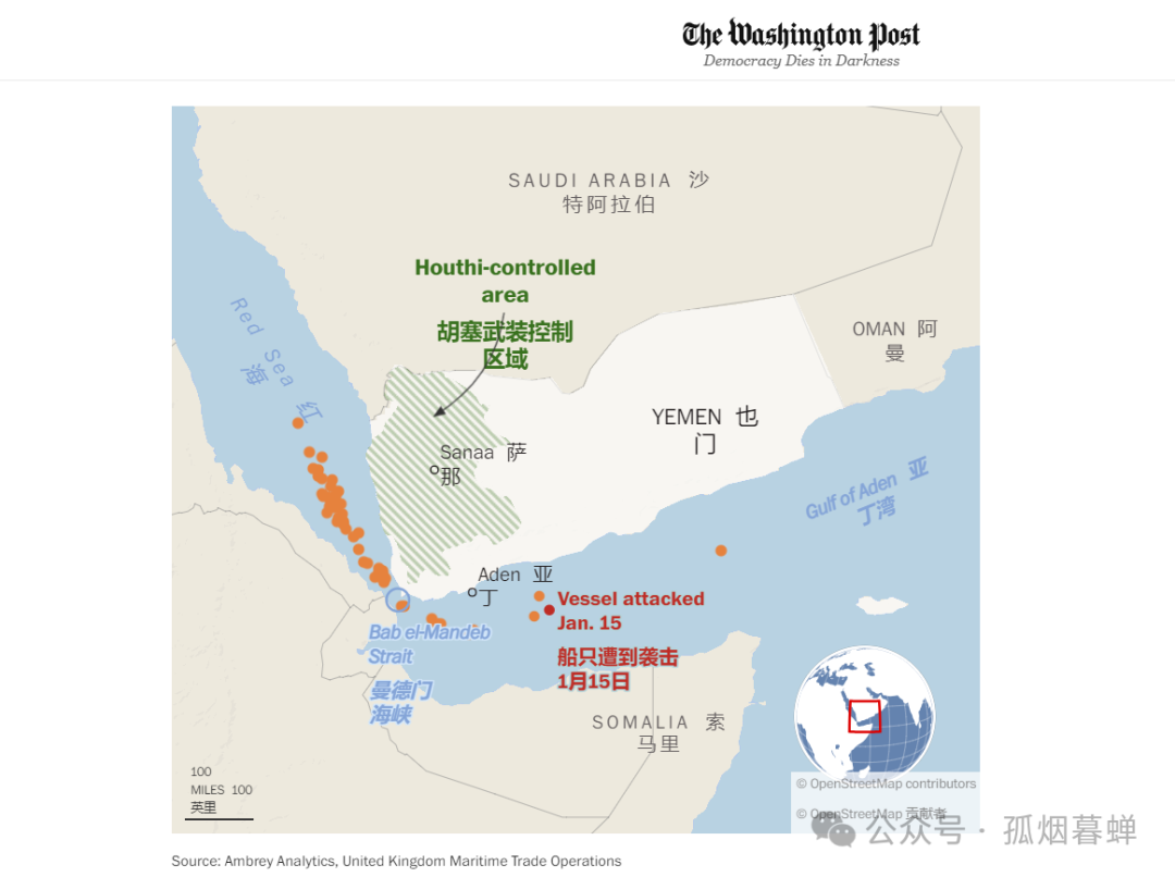 我看了一眼《華盛頓郵報》在相關報道中的配圖,按照他們在配圖中標註出來的信息,“直布羅陀鷹號”實際上是在當地時間1月15日這天,在試圖通過曼德海峽時遭遇的胡塞導彈襲擊。我在網上查了一下這艘船目前的情況,發現它已經跑到北阿拉伯海去了。