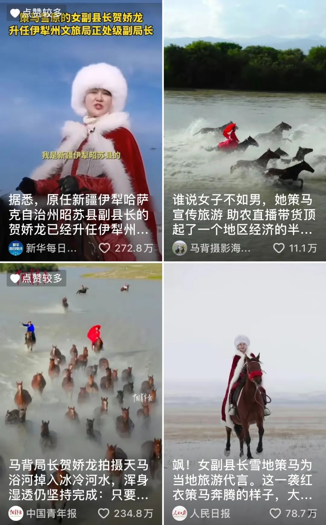 這是新疆伊犁哈薩克自治州昭蘇縣副縣長賀嬌龍在抖音上發佈的短視頻,她是為昭蘇旅遊做宣傳。沒想到她這一“颯”登上了抖音實時熱點榜,真的帶火了昭蘇旅遊。也自此開啓了各地文旅局長上抖音為家鄉“代言”的風潮。