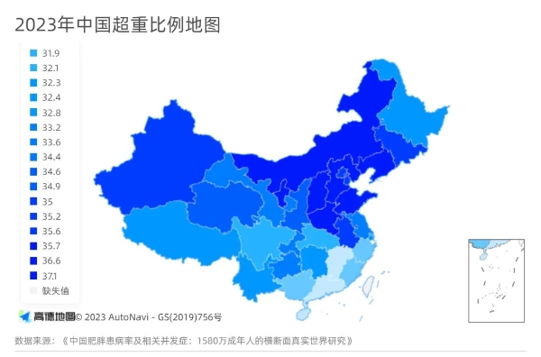 2023年,一項題為《中國肥胖患病率及相關併發症:1580萬成年人的橫斷面真實世界研究》的報告發布,還原出一幅數字版“中國肥胖地圖”。