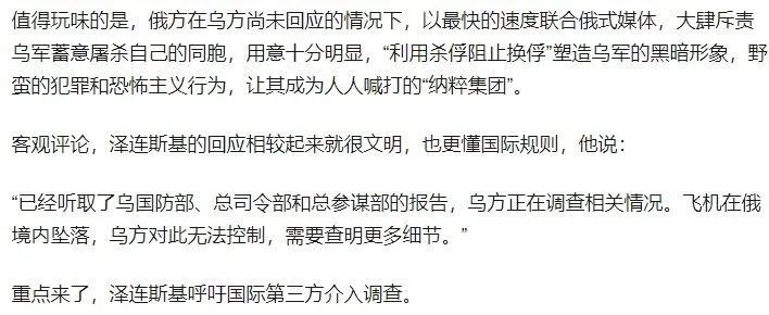 還有稱讚澤連斯基“文明”的,説“重點來了”,因為澤連斯基要求國際第三方介入調查。