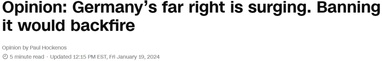 (作者是生活在柏林的德國作家。本文原題“Germany’s far right is surging. Banning it would backfire”,由美國有線電視新聞網網站發佈於2024年1月19日。譯者聽橋,對機器形成的譯文有校閲。)