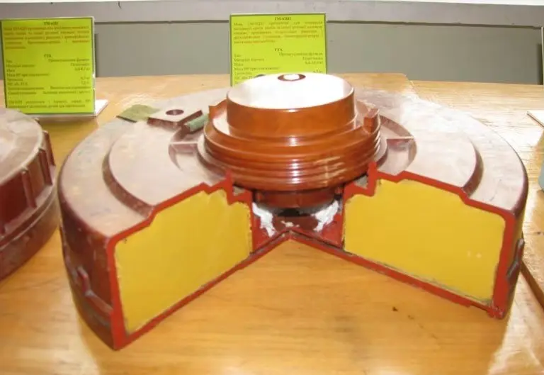 ▲塑料外殼的TM-62P2反坦克地雷解剖模型