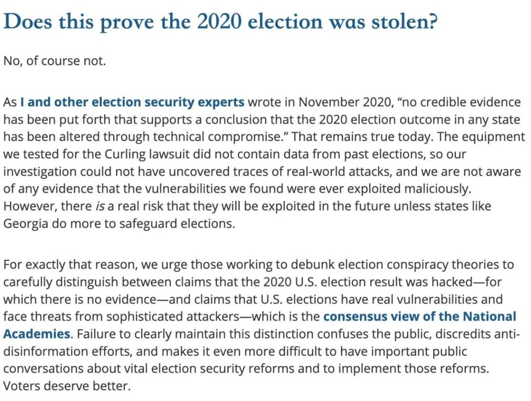 與川普的盟友不同,我們不應該陷入邏輯陷阱,認為理論上的系統潛在漏洞意味着它們已經被人們所利用。同時也需要反覆強調,霍爾德曼的報告是基於對系統的不受限制的訪問,這與選舉的現實環境不同。