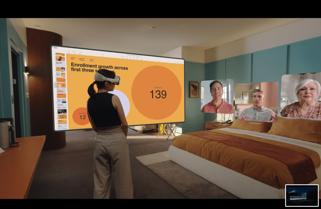 這表明了什麼?這表明它**不僅能在以後顛覆個人移動設備,還極有可能顛覆個人內容消費市場。**只要芯片算力持續提升,遊戲、電影、電話、文字處理、PPT製作以及網頁瀏覽等所有功能,都可以在這個空間中實現,在你帶上Vision Pro之後可以説,整個世界都是你的桌面。